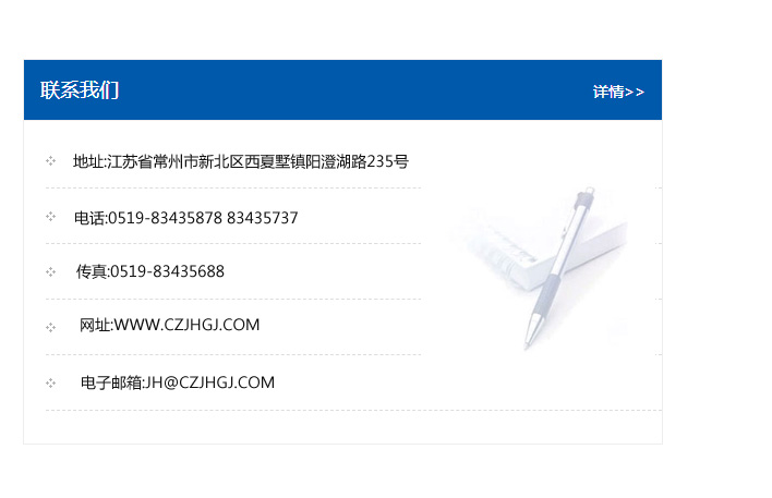 傳真:0519-83435688    郵編:213135    網址:WWW.czjhgj_com.nbjata.com    電子郵箱:JH@czjhgj_com.nbjata.com